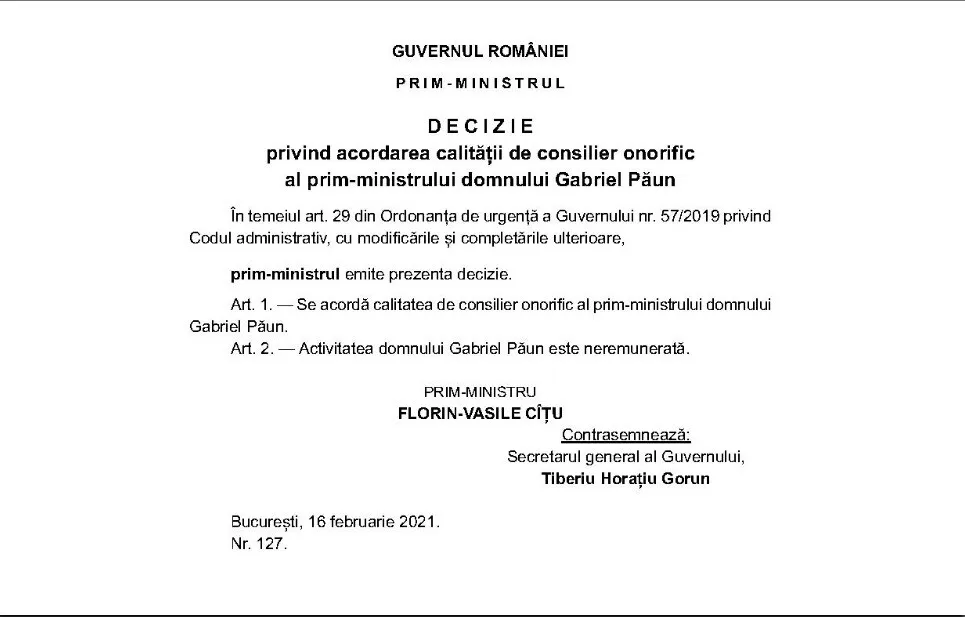 Gabriel Paun a fost numit Consilier Onorific al Prim-Ministrului