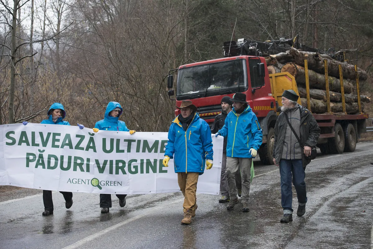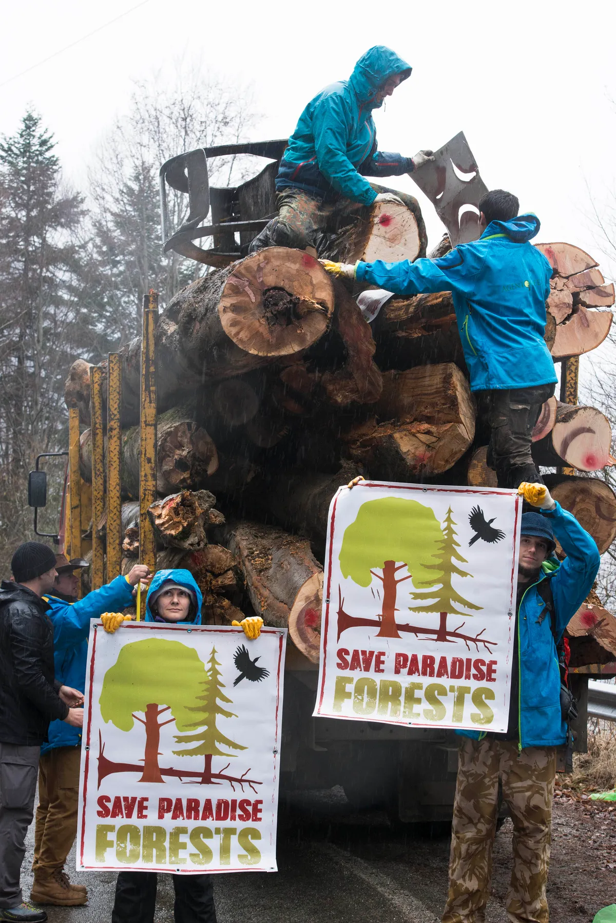 Fagaras Natura 2000 Site, Romania – March 10, 2017: Agent Green and international forest protectors (including scientists and mountaineers) stop logging trucks in Fagaras Mountains Natura 2000 site and call on Romanian Government to take action saving Europe’s last large primary forests in Romania.