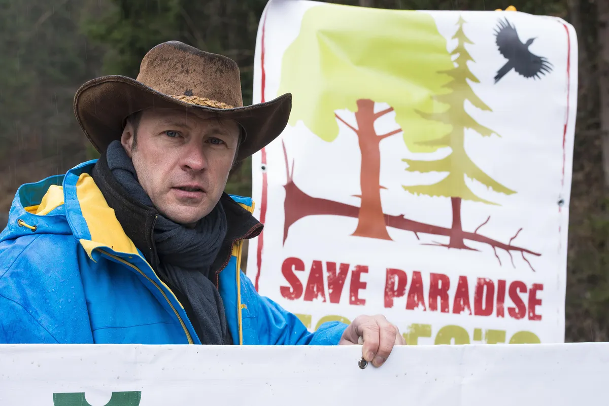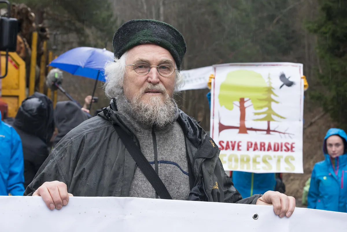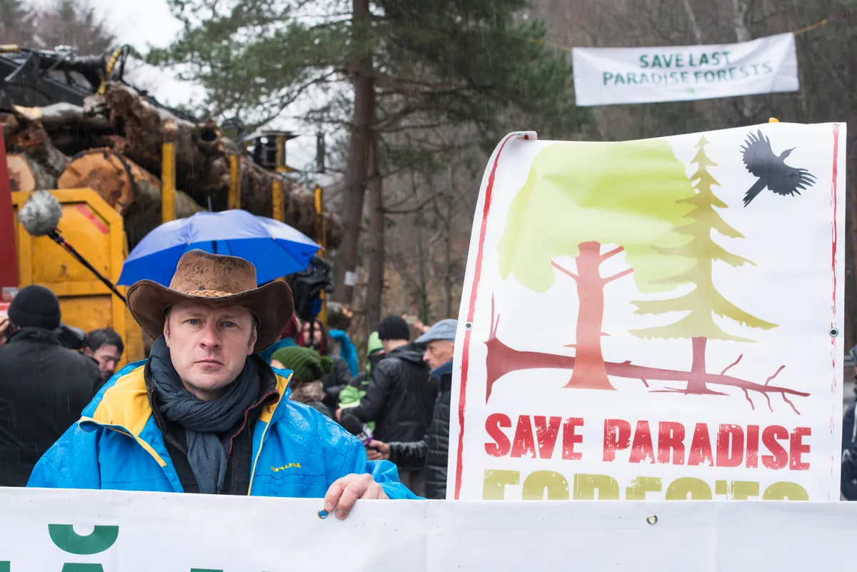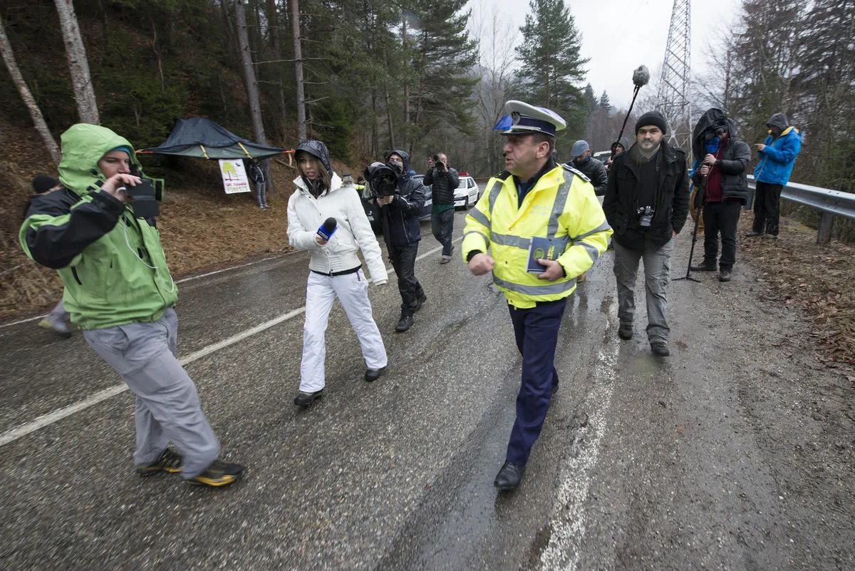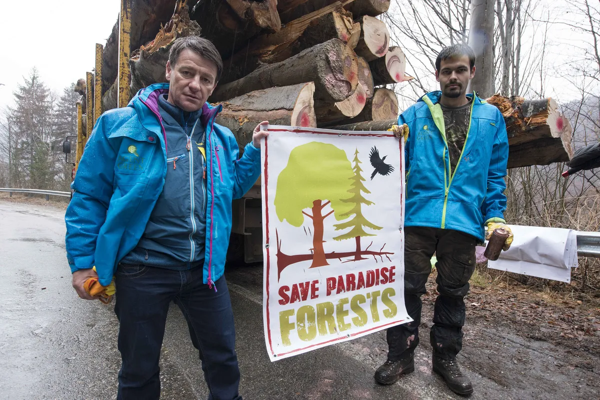 Fagaras Natura 2000 Site, Romania – March 10, 2017: Agent Green and international forest protectors (including scientists and mountaineers) stop logging trucks in Fagaras Mountains Natura 2000 site and call on Romanian Government to take action saving Europe’s last large primary forests in Romania. Zolt Torok, Romanian climber of the year 2016.