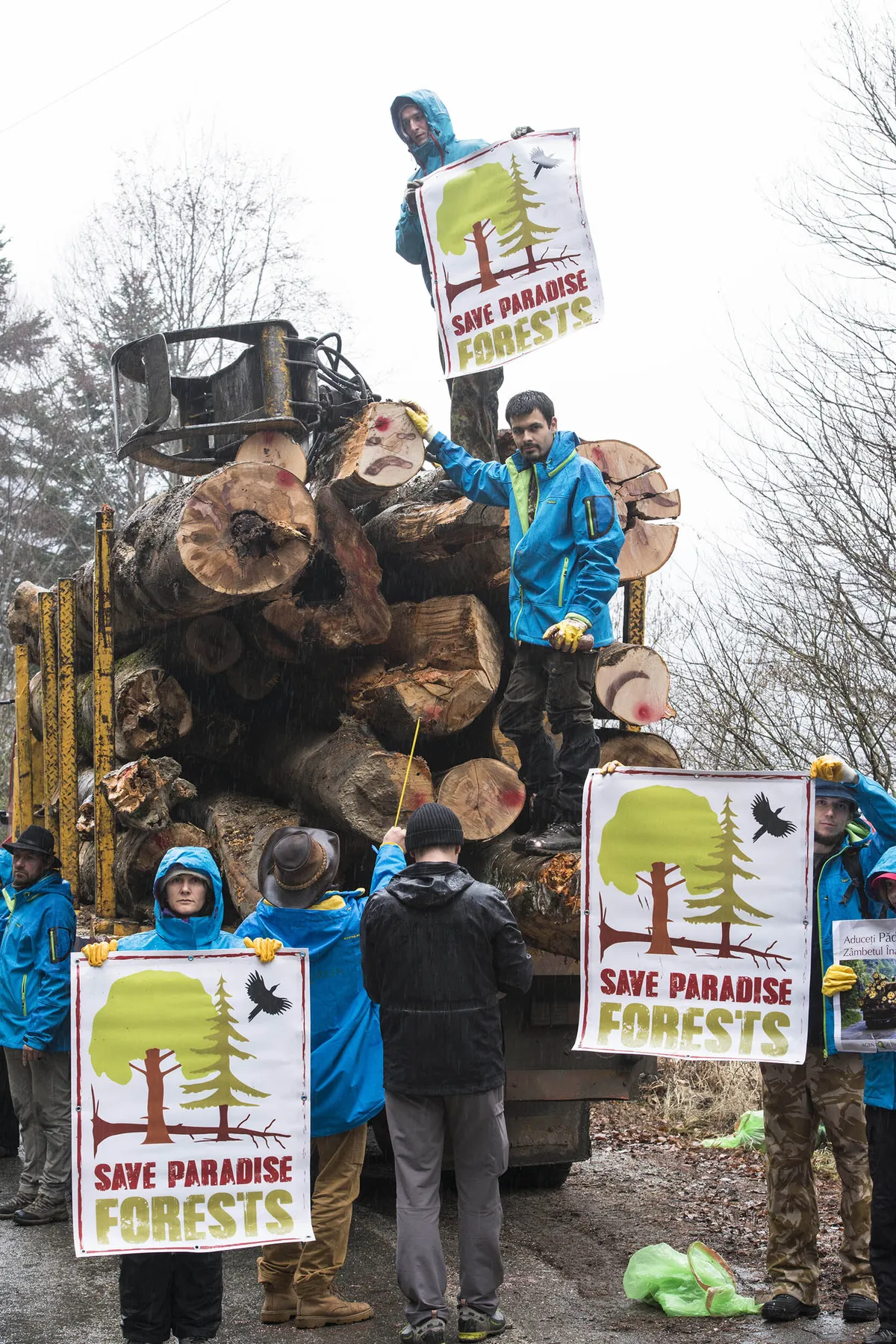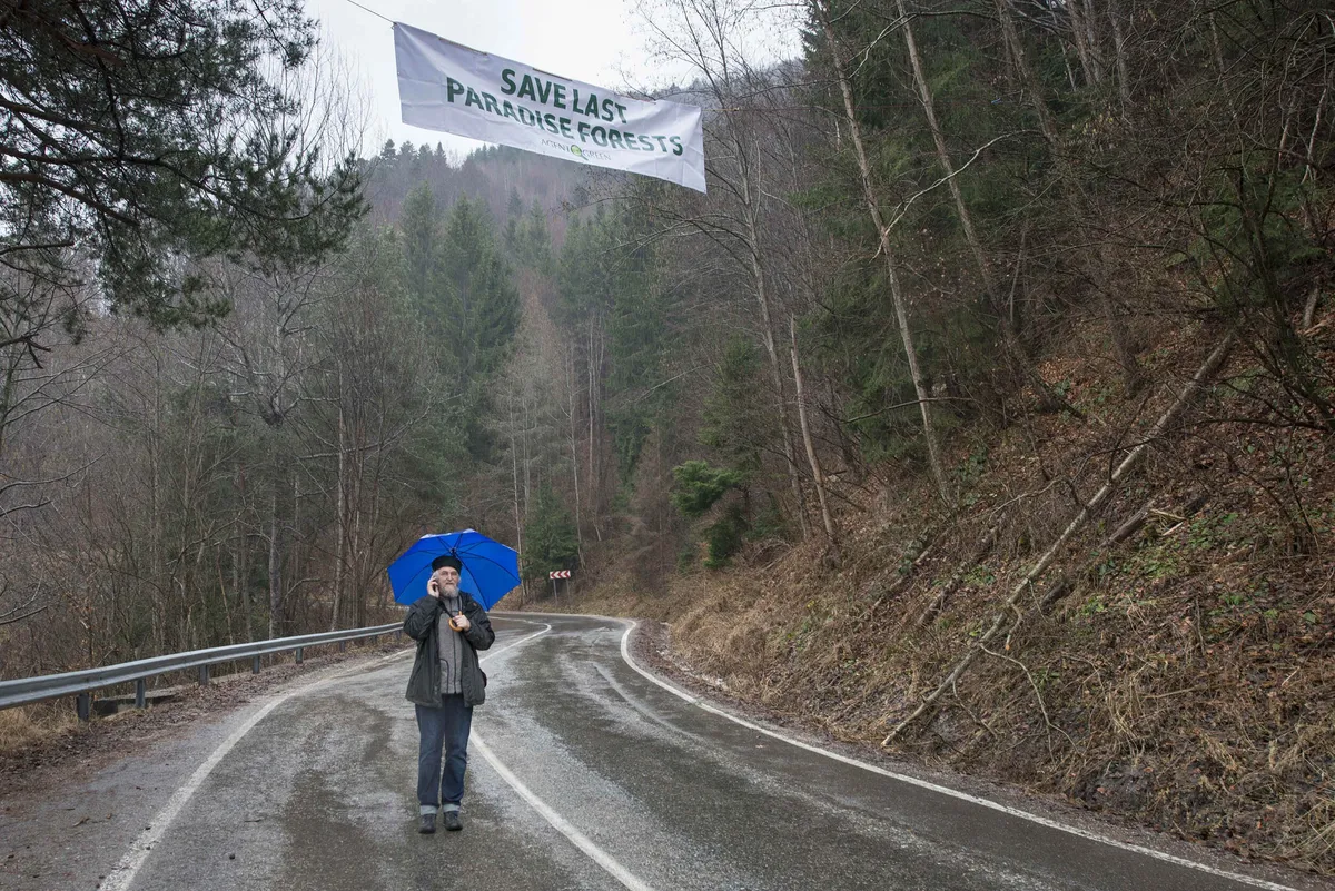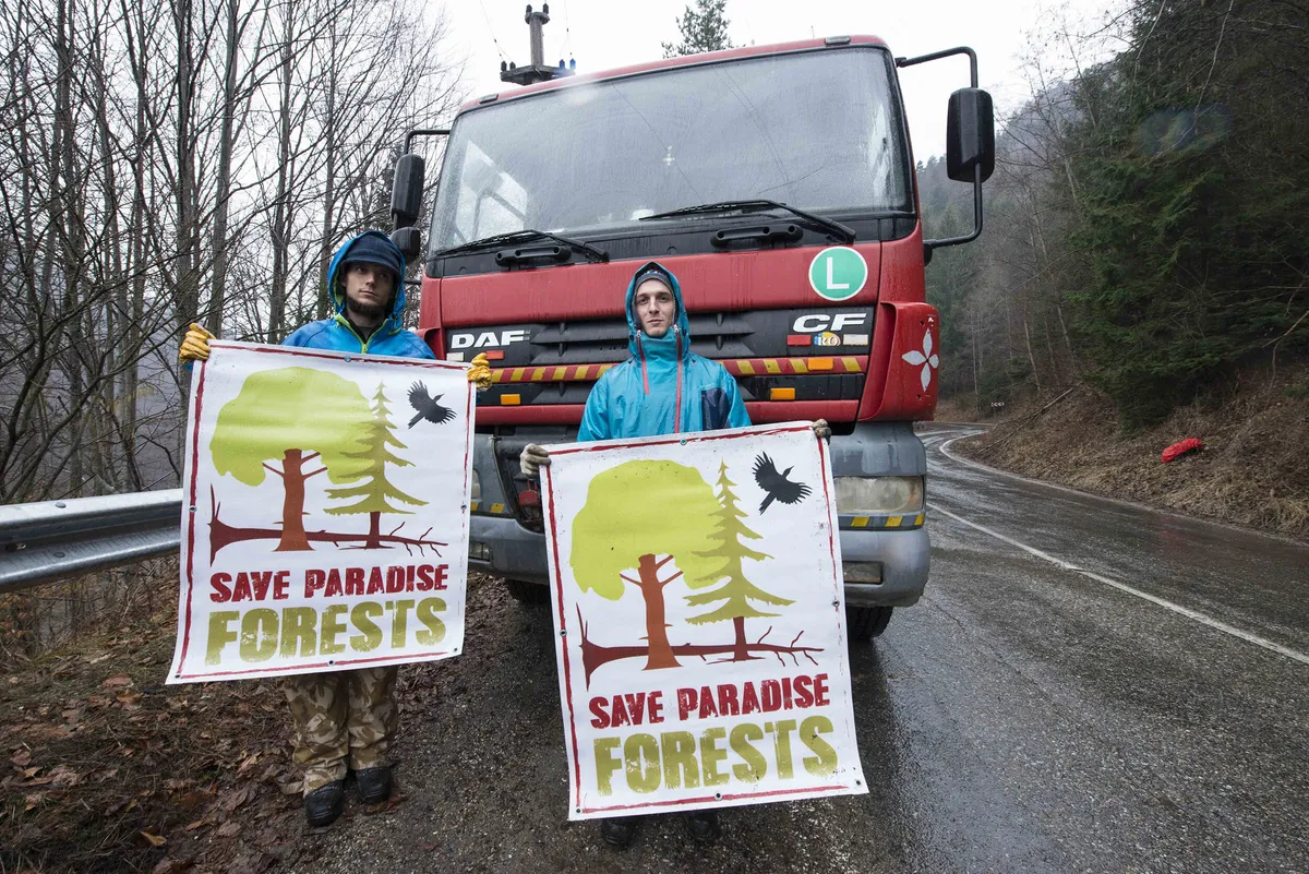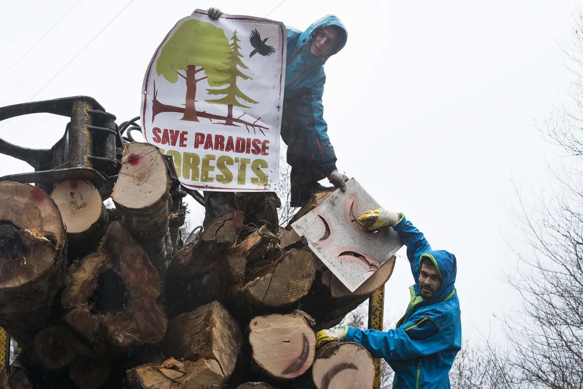Fagaras Natura 2000 Site, Romania – March 10, 2017: Agent Green and forest protectors (international including scientists and mountaineers) stop logging trucks in Fagaras Mountains Natura 2000 site and call on Romanian Government to take action saving Europe’s last large primary forests in Romania.