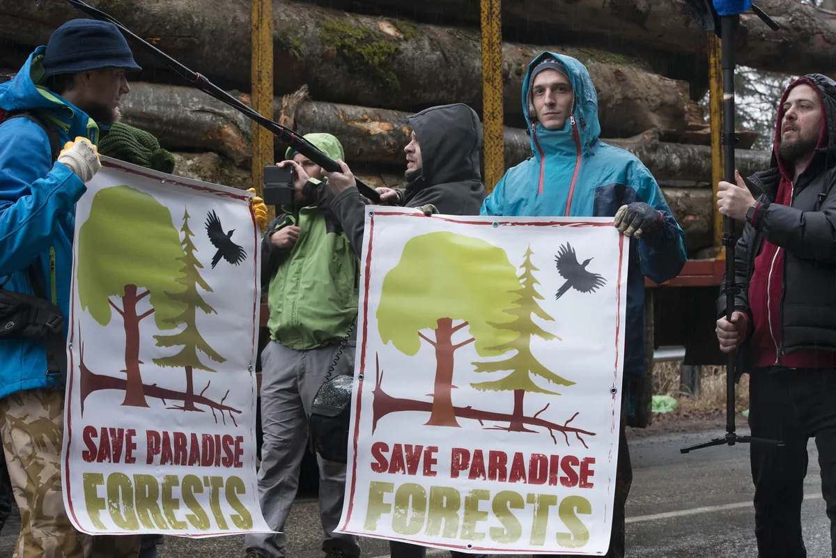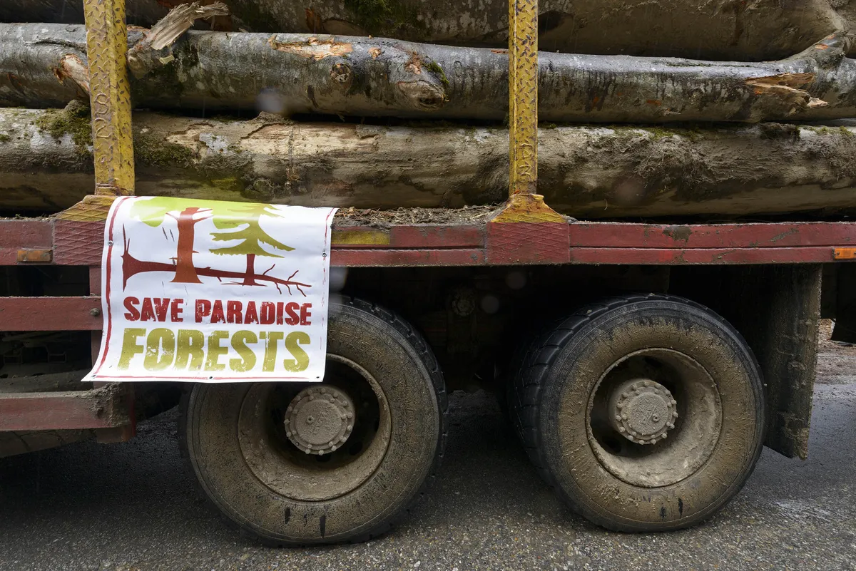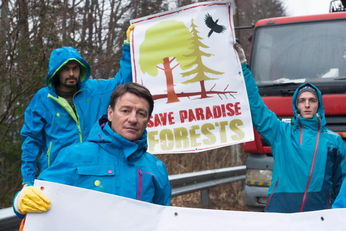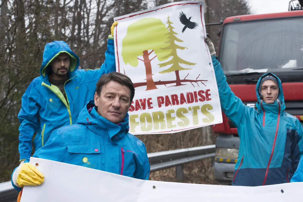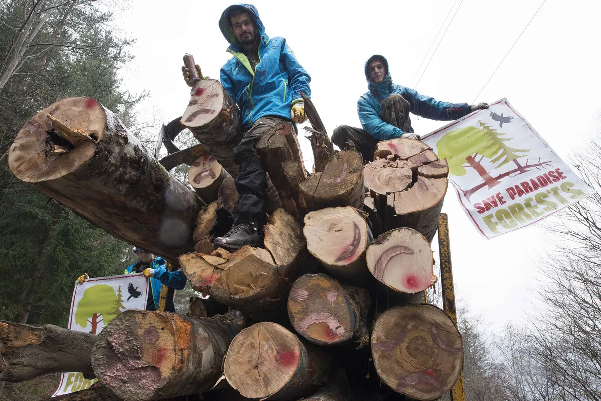 Fagaras Natura 2000 Site, Romania – March 10, 2017: Agent Green and forest protectors (international including scientists and mountaineers) stop logging trucks in Fagaras Mountains Natura 2000 site and call on Romanian Government to take action saving Europe’s last large primary forests in Romania.