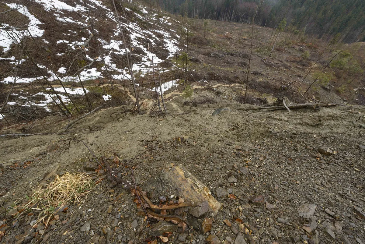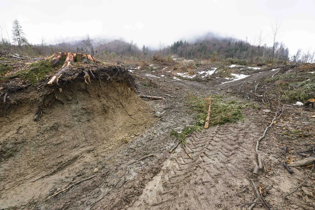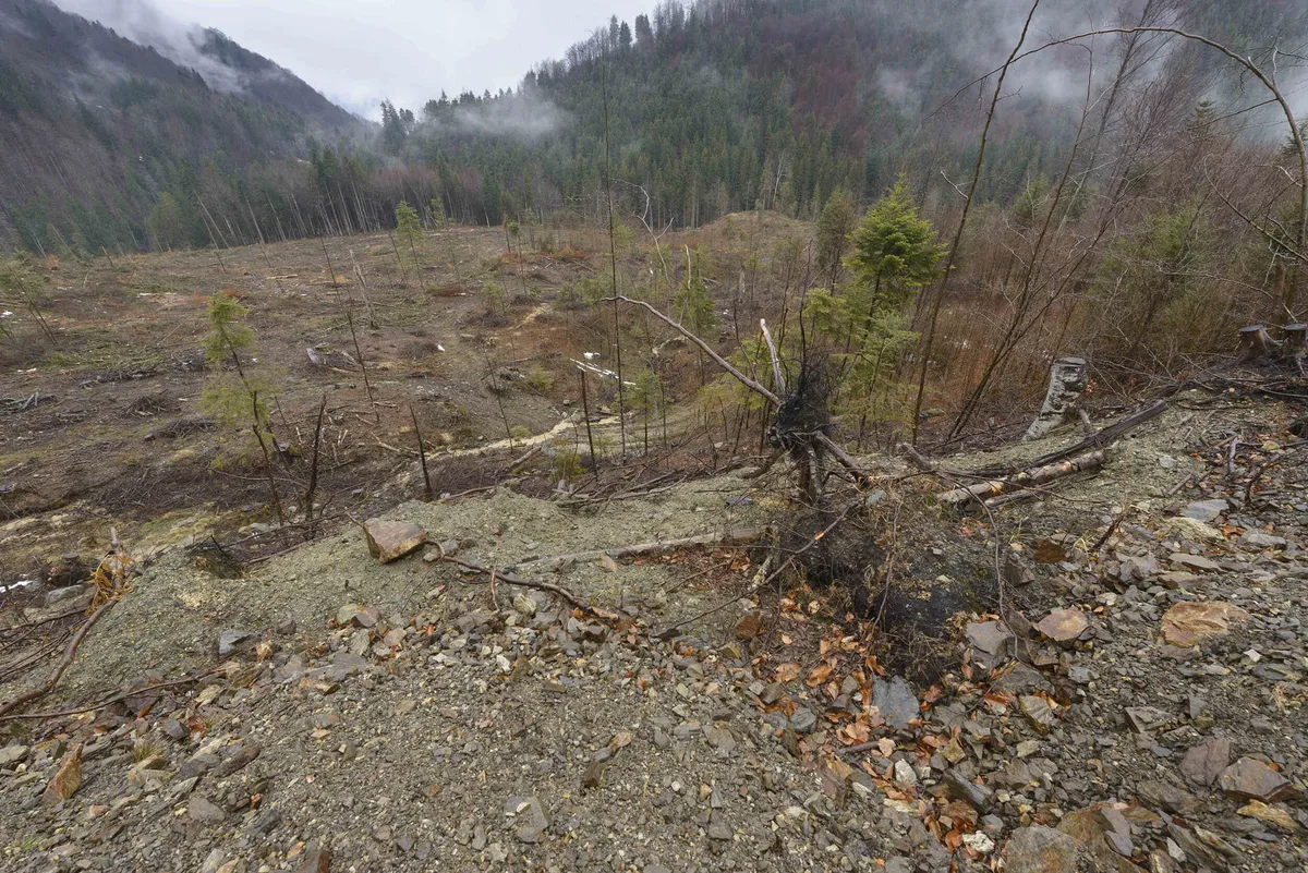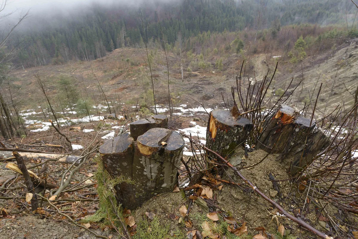 Fagaras Natura 2000 Site, Romania – March 10, 2017: Clearcut close to the site of the protest action by Agent Green and forest protectors (international including scientists and mountaineers) who stopped logging trucks in Fagaras Mountains Natura 2000 site and called on Romanian Government to take action saving Europe’s last large primary forests in Romania.