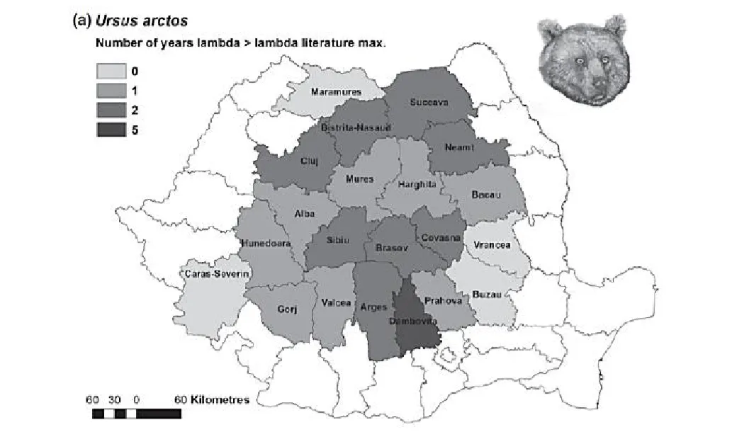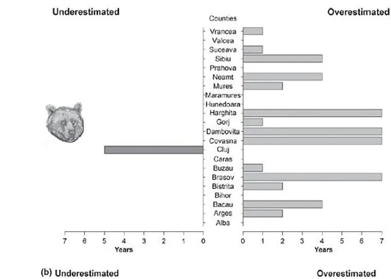 **Figura 2.**Din Popescu și colab. 2016. Numărul de ani, din maximum șapte, în care dimensiunile populației de urși au fost supraestimate în comparație cu traiectoriile populației din alte populații europene studiate îndelung.