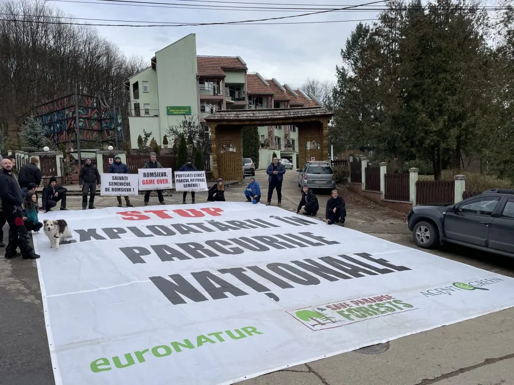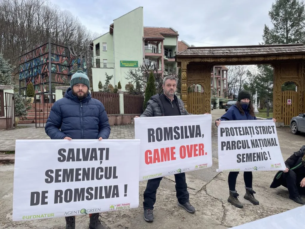 Reșița, 16 decembrie 2022 – Agent Green protestează astăzi în Parcul Național Semenic – Cheile Carașului și la sediul administrației parcului din Reșița pentru a atrage atenția Ministerului Mediului că trebuie să elimine Romsilva de la conducere întrucât a încălcat în formă continuată obligațiile contractuale de protejare a parcului în ultimii 18 ani. Voluntarii organizației au desfășuat într-o zonă tăiată la ras din inima parcului un banner de 96 metri pătrați cu mesajul: ”Ministerul Mediului: STOP EXPLOATĂRII ÎN PARCURILE NAȚIONALE”. Protestul a continuat la sediul administrației parcului situat în clădirea direcției silvice Reșița unde activiștii au afișat bannere cu mesajele: ”SALVAȚI SEMENICUL DE ROMSILVA”,”ROMSILVA, GAME OVER”și ”PROTEJAȚI STRICT PARCUL NAȚIONAL SEMENIC”.
