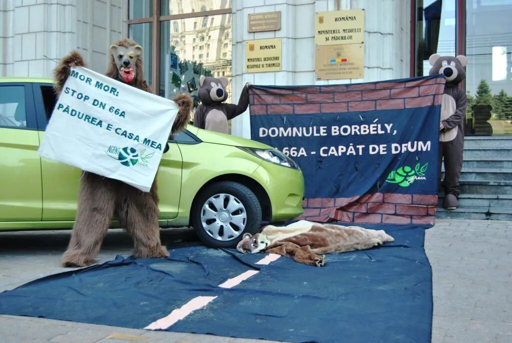 La intrarea in minister voluntari imbracati in costume de urs brun sustin un zid pe care scrie ”DOMNULE BORBELY, DN 66A – CAPAT DE DRUM” si cer ministrului sa opreasca definitiv constructia drumului pe criterii strict stiintifice. In timp ce o ursoaica lovita de o masina zace moarta intr-o balta de sange, un urs suparat arata un banner pe care scrie ”STOP DN 66A – PADUREA E CASA MEA!”. „„Am ales sa oferim ministrului aceasta scena pentru ca reflecta intru totul pericolul la care sunt expuse toate animalele salbatice din zona o data cu constructia acestui drum. Ursul brun este cea mai sensibila specie la fragmentarea habitatului. Asfaltul este primul pas pentru distrugerea habitatului ursului si a celorlate specii identificate de noi in cadrul studiului pe care il efectuam. Ramificarea infrastructurii si constructiile ce vor urma vor conduce la scaderea drastica a biodiversitatii in zona. Ii cerem ministrului sa nu permita asa ceva”, spune Luminita Tanasie, Manager Programe, WWF România.