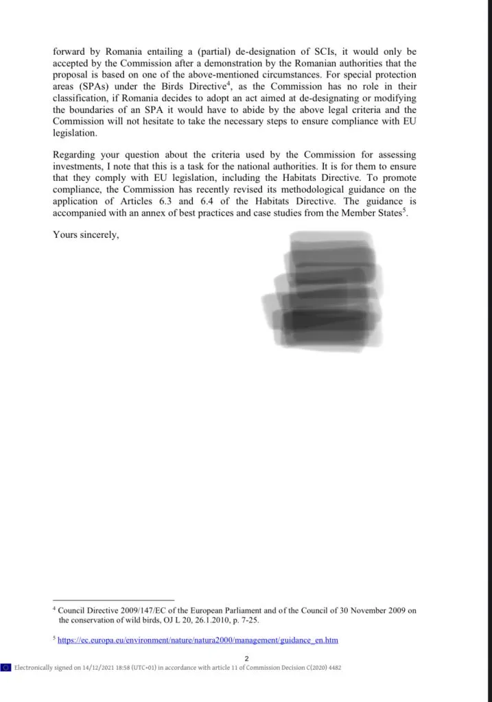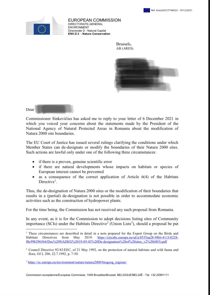 Prin scrisoarea remisă astăzi de Comisia Europeană avocatului Agent Green se clarifică aspecte privind intenția Parlamentului României și a Agenției Naționale pentru Arii Protejate (ANANP) de a modifica limitele ariilor protejate sau chiar de a le desființa în totalitate pentru a facilita investiții economice.