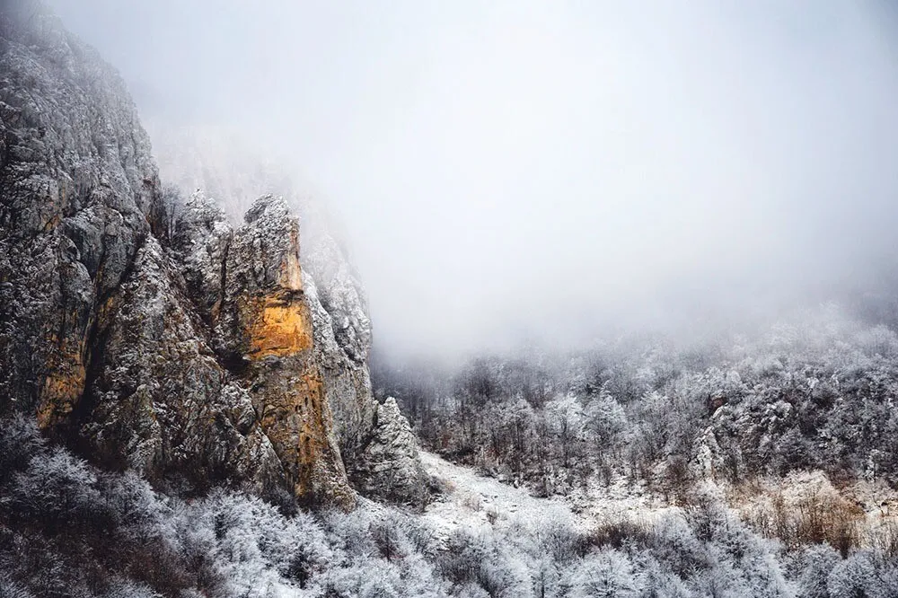 – Am urcat din Lupeni la Straja, cu un prieten căruia îi plăcea să schieze. Eu nu schiez, dar am zis să profit și să mă plimb un pic prin locul acela superb. Era zăpadă mare, vremea era bună, cu liniștea aceea de munte în care îți auzi doar pașii prin omăt… Așa că am luat telescaunul, am urcat sus pe platou și am pornit pe o pârtie dezafectată. Cred că am mers cinci minute. Și s-a pornit nebunia: brusc, s-a lăsat o ceață deasă și imediat a început un viscol de nu îmi vedeam mâinile! M-am panicat atunci. În primul rând, că pe o asemenea vreme îți pierzi noțiunea de spațiu, nu mai știi unde ești sau în ce direcție mergi. M-am aplecat și am încercat să îmi găsesc urmele în zăpadă, să mă întorc de unde am plecat, numai că nu se mai vedea nimic, viscolul le ștersese deja. Când m-am mai liniștit un pic, mi-am zis că cel mai bine este să cobor, pentru că sigur în vale o să dau de civilizație, dar și asta era destul de riscant, puteam să cad într-o râpă și să nu mă mai găsească nimeni până în primăvară. Am încercat să fac ceva fotografii, dar imediat bateria aparatului s-a golit, din cauza frigului. Eu eram numai promoroacă tot, aveam barba înghețată, fularul era ca de gheață. În general, nu îmi risc viața pentru o imagine, însă atunci am fost luat prin surprindere și a fost pentru prima oară când m-am gândit că sunt în pericol real să-mi sfârșesc zilele. Și asta, în condițiile în care eram echipat! Atunci am înțeles cât de neiertător și periculos poate să fie muntele. Atunci l-am simțit pentru prima oară ca pe o ființă gigantică, ce-ar putea să te strivească atât de ușor. Eram efectiv la mila lui, și cumva, i-am înțeles pe cei din vechime, care tratau muntele ca pe ceva sfânt sau chiar ca pe o zeitate căreia îi aduceau ofrande ca să o îmbuneze. Am reușit să fac, totuși, câteva fotografii, iar aceasta este una dintre ele. Pare că a fost făcută noaptea, dar de fapt era la prânz, atât de tare se întunecase. Privind la acei brazi, mi-am dat seama că muntele le aparține acelor ființe iar eu sunt un intrus.